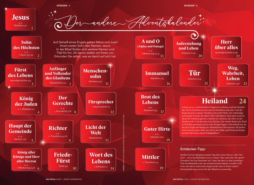 Denken Sie bis Heiligabend jeden Tag über einen Namen oder Titel nach – ohne die Bibelstelle zuvor zu lesen. Was verbinden Sie damit? Schreiben Sie Ihre Gedanken auf. Lesen Sie dann zu dem jeweiligen Titel die Bibelstelle oder das entsprechende Kapitel. Inwiefern hilft Ihnen die damit verbundene Eigenschaft Jesu in Ihrem Leben? Herausforderung: Lernen Sie den Bibelvers auswendig.